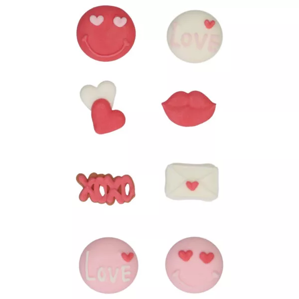 Platziere die FunCakes Zuckerdekorationen in einer schönen Spirale auf einem Kuchen oder Cupcake oder in Royal Icing auf einem Keks. So verleihst du deinen Leckereien im Handumdrehen ein passendes Thema. Dieses Love Set enthält 8 Dekorationen in Rot, Rosa und Weiß: 2 Smileys, 2 Herzsymbole, Herzen, xoxo, Lippen und einen Liebesbrief. Sie sind absolut perfekt für Valentinstag und Muttertag.